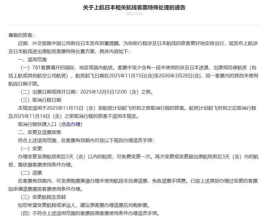 上航适用条件适用范围:781客票填开的国际、地区或国内航班。客票中至少含有一段未使用的涉及日本进港、出港或经停航班(包括上航或其他航空公司航班),航班起飞日期在2025年11月15日(含)至2026年3月28日(含),同一客票内的其他未使用航段日期不限。出票日期或换开日期:2025年12月5日12:00(含)之前。取消行程日期:本规定适用于2025年11月15日(含)至航班计划起飞时刻之前取消行程的旅客。航班计划起飞时刻之后取消行程及2025年11月14日(含)之前取消行程的旅客不适用本规定。